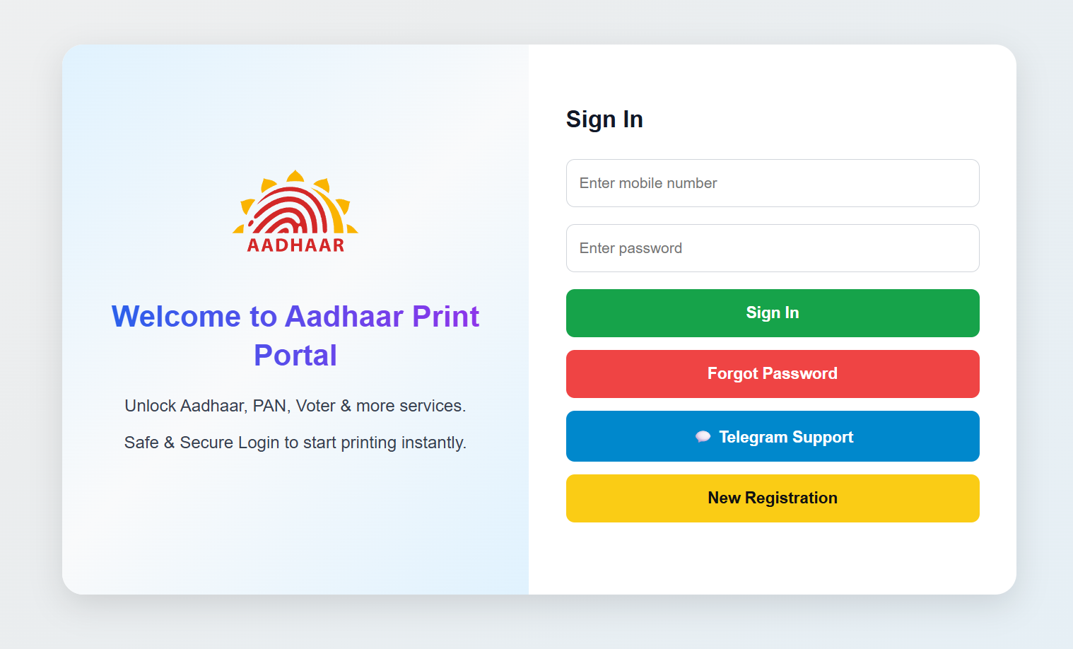 The Aadhaar Print Portal operates strictly for authorized and verified document access. All transactions must comply with UIDAI, NSDL, EPIC, and other government regulatory guidelines. Unauthorized duplication or misuse of identity documents is strictly prohibited.